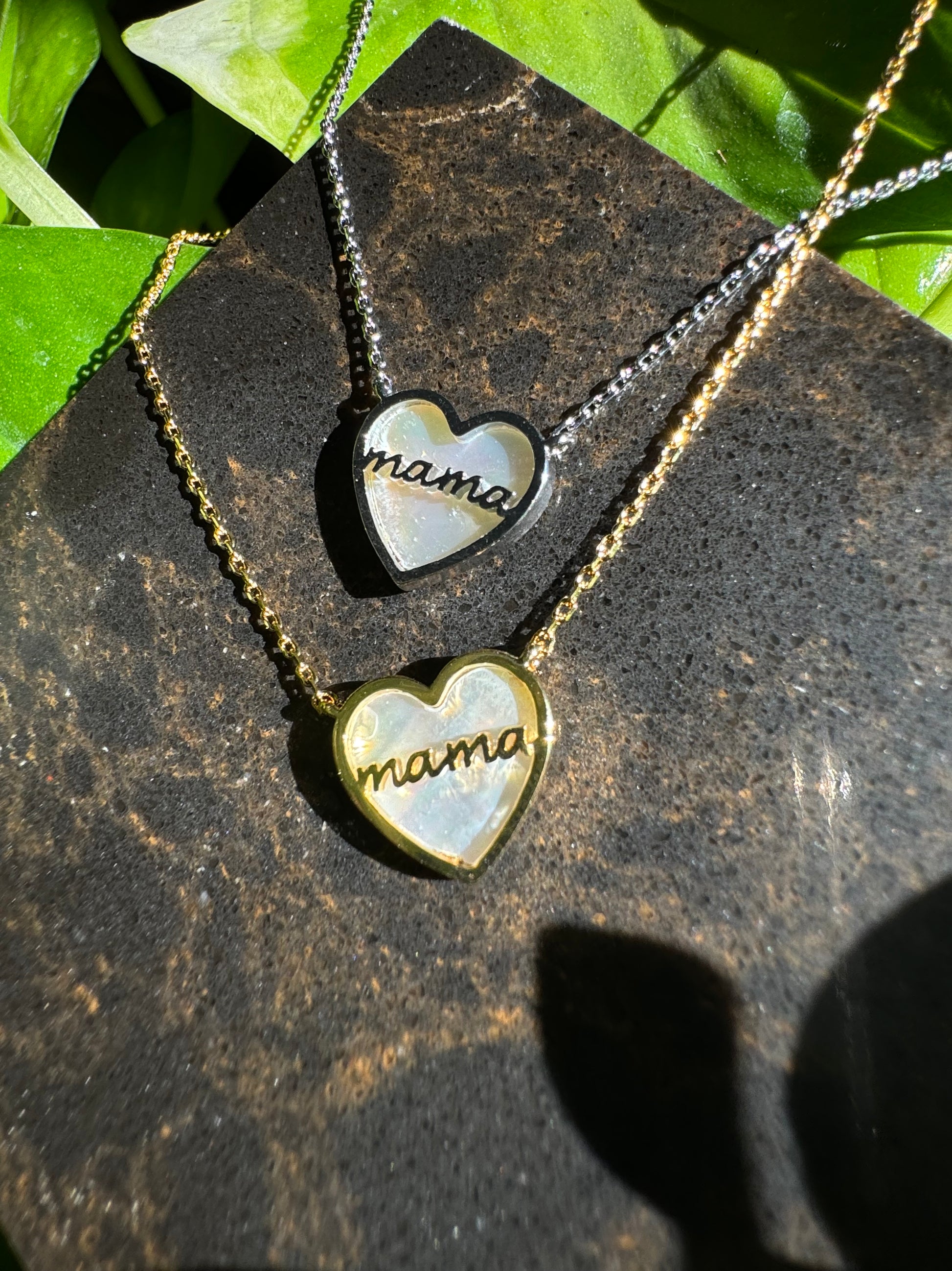 The cutest pendant heart with ‘mama’ atop a shimmery backdrop.